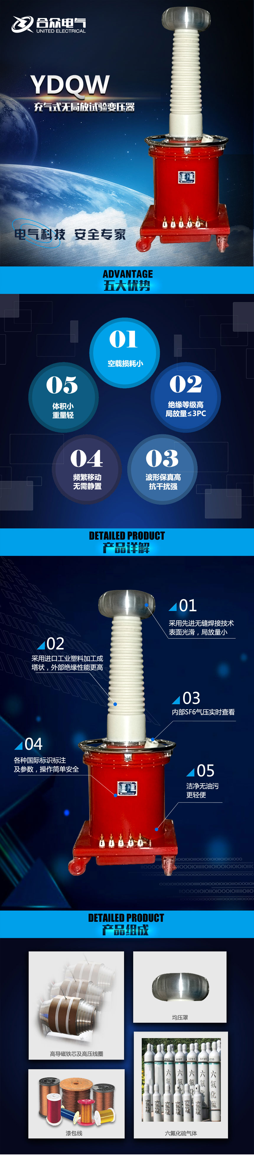 無局放試驗變壓器(充氣式),是合眾電氣經過多年的努力,研究成功的充氣式無局放輕型試驗變壓器,無油污染,單臺試驗變壓器的電壓等級可達300KV。由于采用了新的生產工藝,產品的技術性能有較大的提高,特別適用于現場工作及頻繁移動的工作條件下使用。