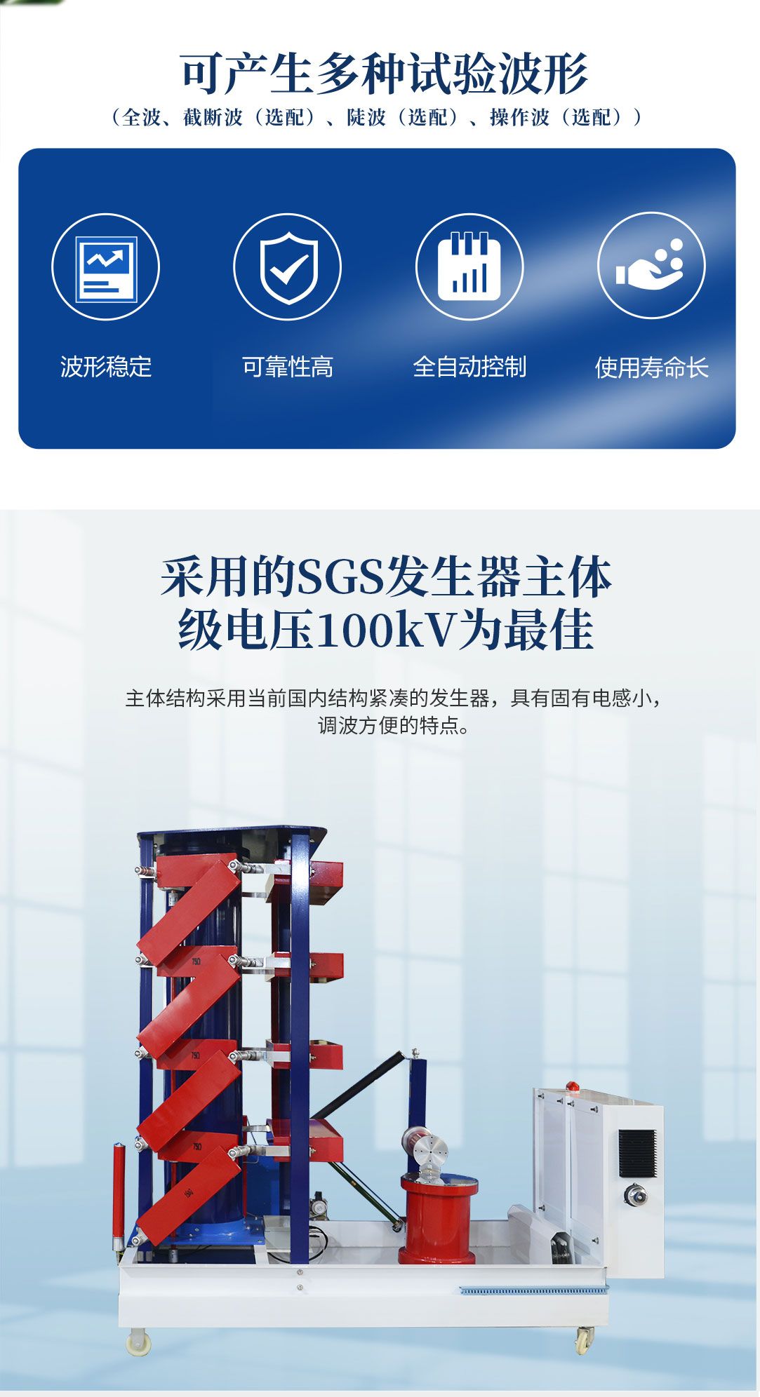 波頭時間:1.2±30%μs,波尾時間:50±20%μs,過沖:小于5%,效率:不低于90%。±1.2/50μs標準雷電沖擊電壓全波,效率大于90%。