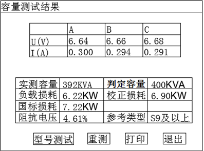 實測容量:該項顯示實際測量的變壓器的容量。