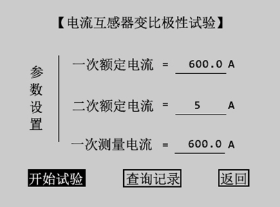 在互感器綜合特性測試儀CT測試主界面上轉動旋轉鼠標,選擇變比極性試驗,按下旋轉鼠標則進入圖3.18所示的CT變比極性試驗參數設置界面。