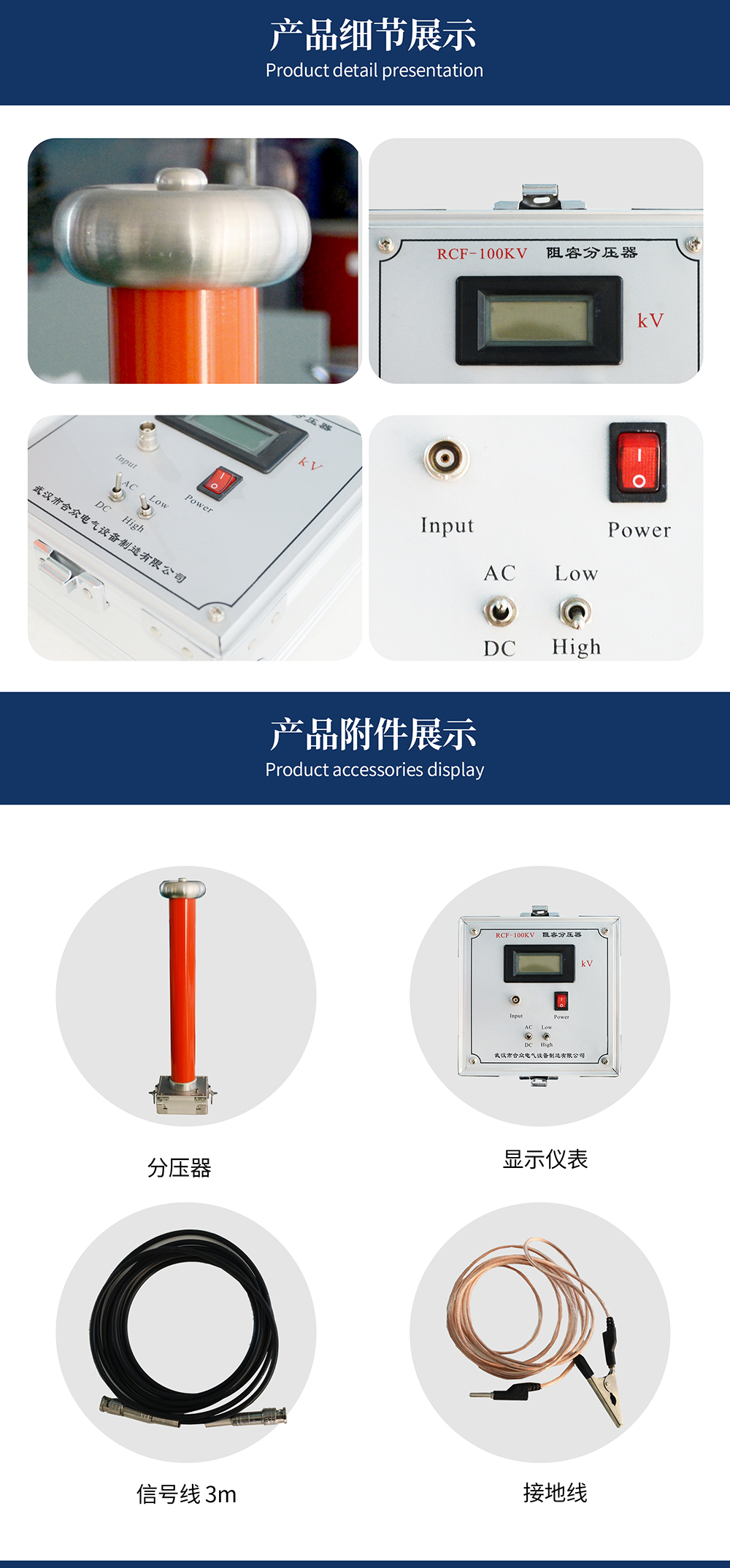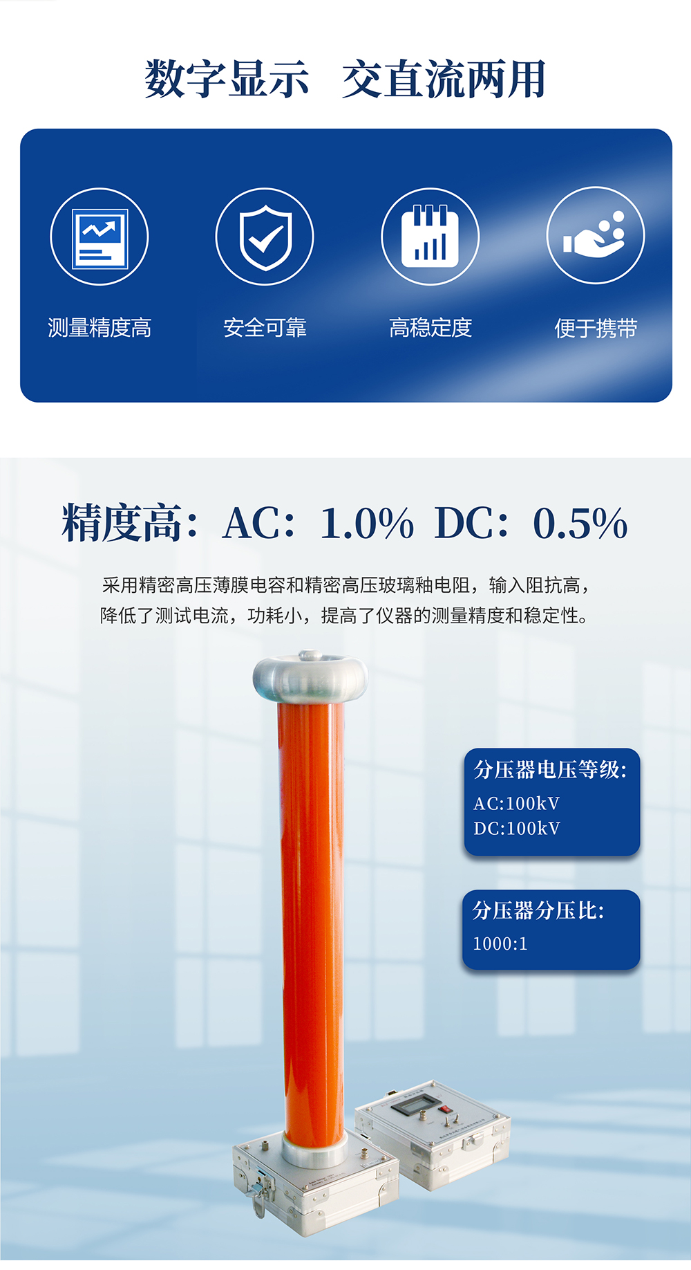 本產(chǎn)品作為高電壓測(cè)量之理想設(shè)備,主要用于電力系統(tǒng)及電氣電子設(shè)備制造部門(mén)測(cè)量工頻交流高電壓和直流高電壓。本儀器由高壓分壓器和低壓顯示表兩部分組成,兩者采用配套電纜連接使用。