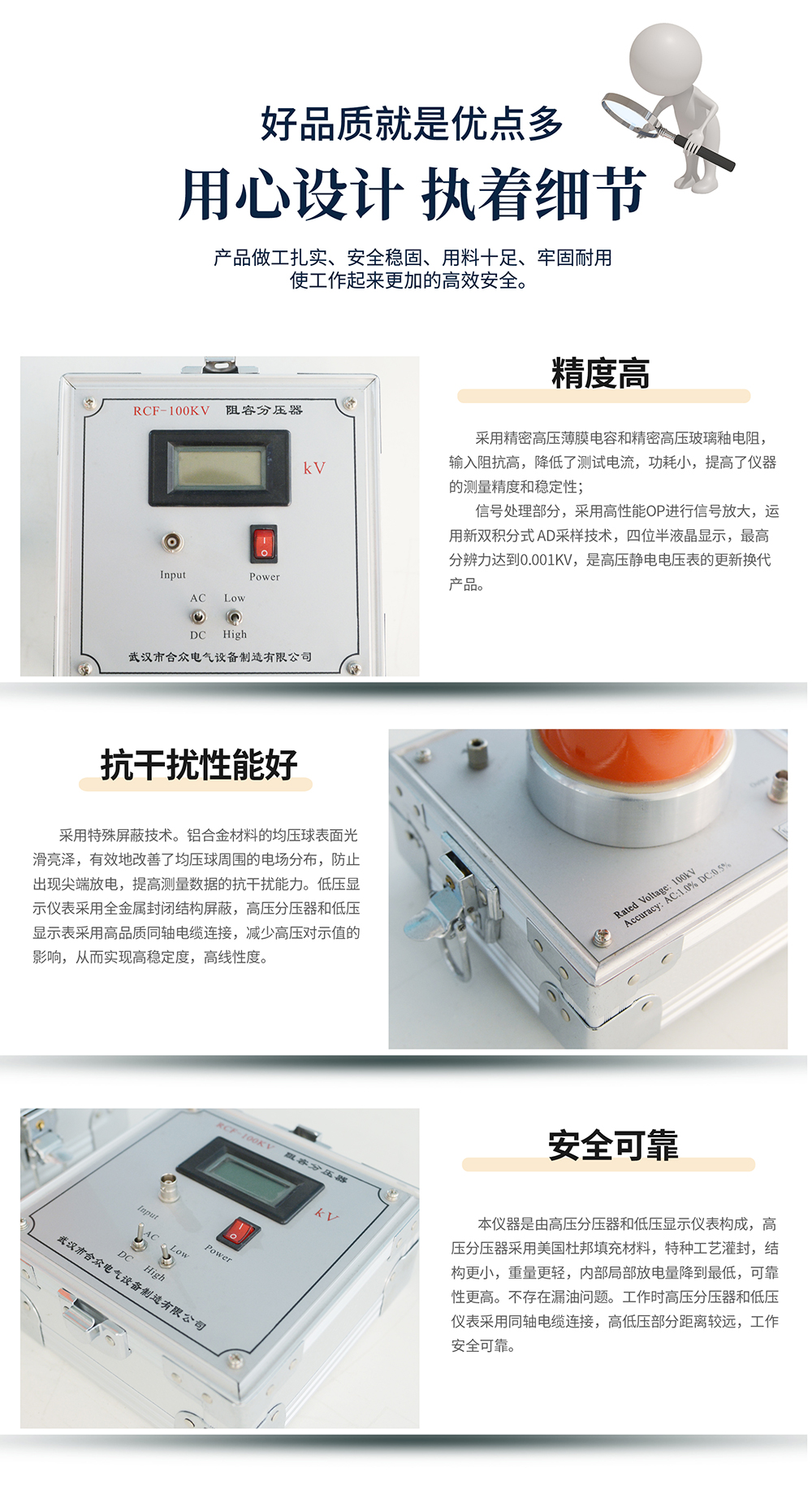 采用特殊屏蔽技術(shù)。鋁合金材料的均壓球表面光滑亮澤,有效地改善了均壓球周?chē)碾妶?chǎng)分布,防止出現(xiàn)尖端放電,提高測(cè)量數(shù)據(jù)的抗干擾能力。低壓顯示儀表采用全金屬封閉結(jié)構(gòu)屏蔽,高壓分壓器和低壓顯示表采用高品質(zhì)同軸電纜連接,減少高壓對(duì)示值的影響,從而實(shí)現(xiàn)高穩(wěn)定度,高線性度。