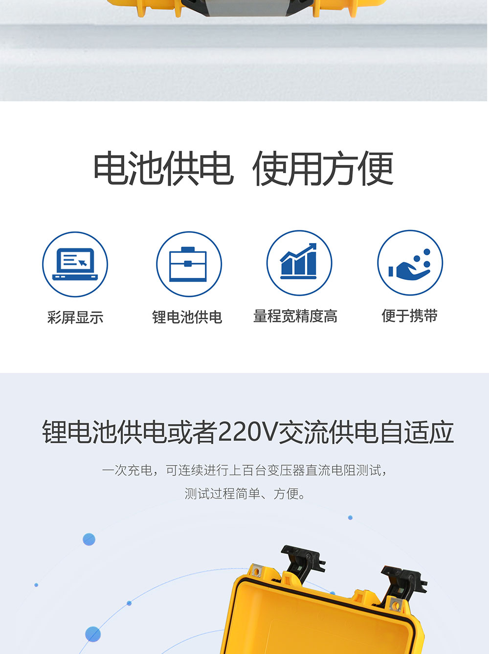 1、鋰電池供電或者220V交流供電自適應,一次充電,可連續進行上百臺變壓器直流電阻測試,測試過程簡單、方便。