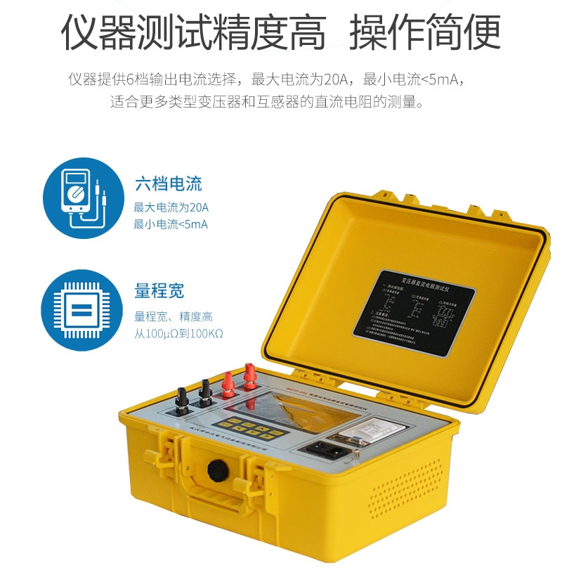 1、儀器提供6檔輸出電流選擇,最大電流為20A,最小電流<5mA,適合更多類型變壓器和互感器的直流電阻的測量。